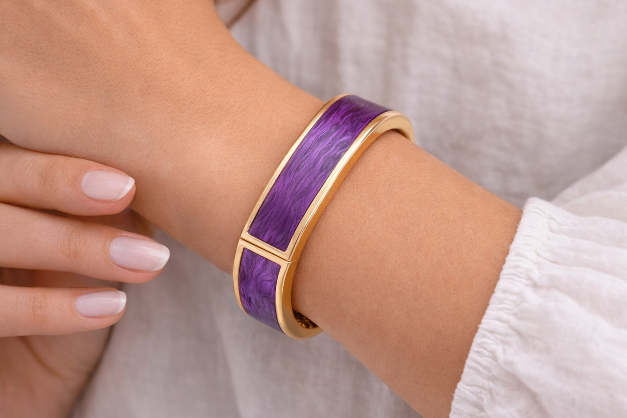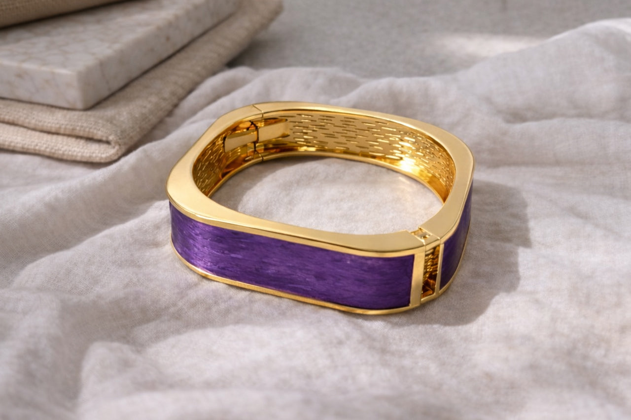 A bold expression of modern luxury, this elegant statement bangle features a sleek structured design enhanced with rich enamel detailing available in Blue and Purple variants. Crafted with 18K gold plating and a premium 3-micron finish, the polished gold frame beautifully complements the vibrant enamel, creating a refined piece that stands out effortlessly.