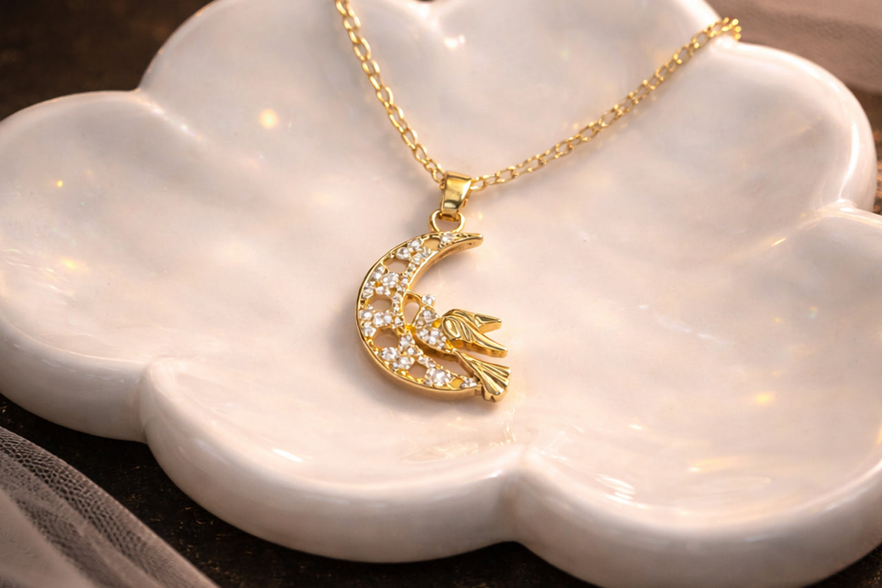 Gracefully crafted in a radiant 18K gold-plated finish, this pendant brings together the serenity of the moon and the spirit of a bird in motion. The crescent moon is adorned with subtle stone accents that reflect light beautifully, while the sculpted bird adds a sense of movement and meaning.
