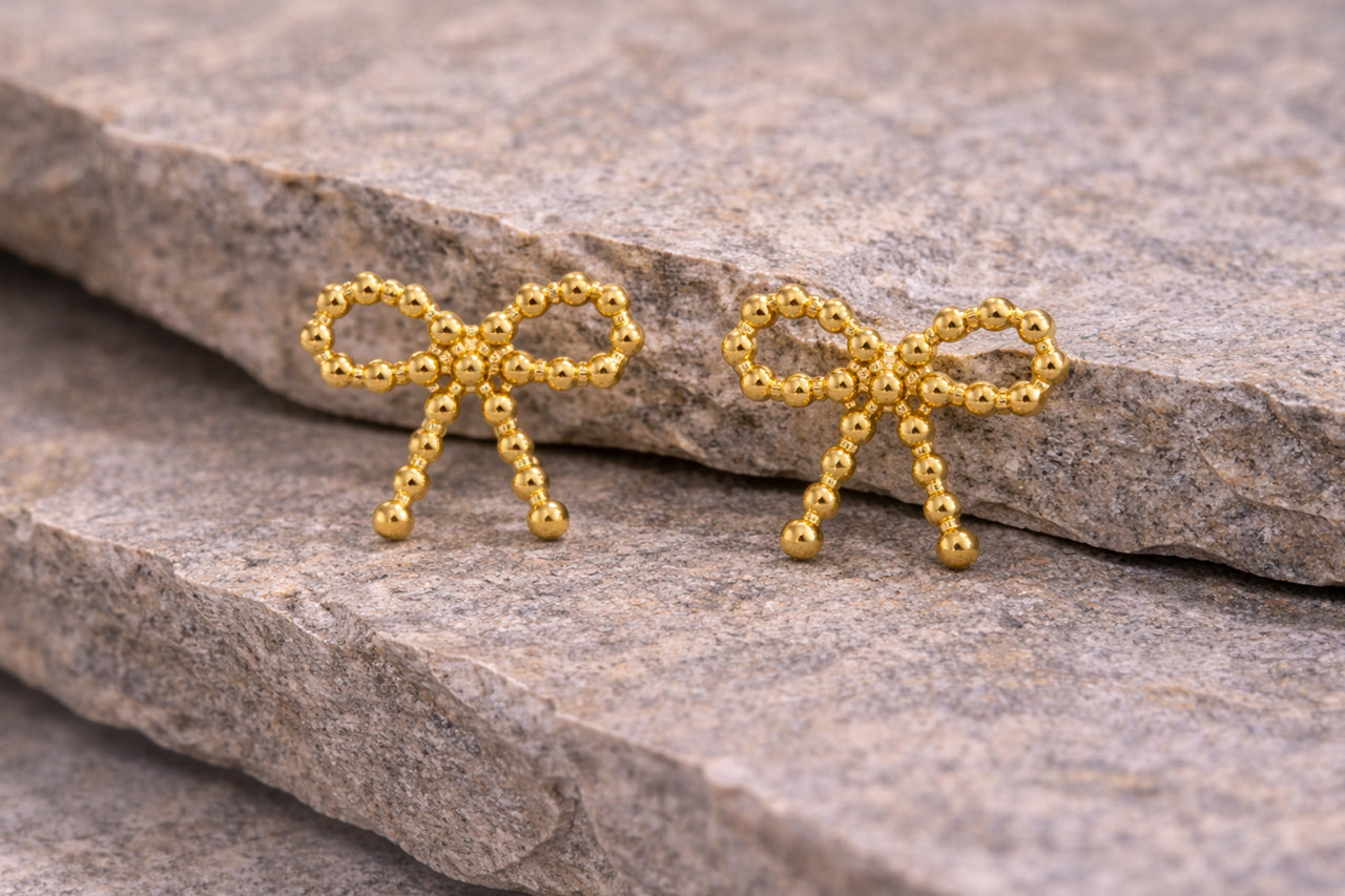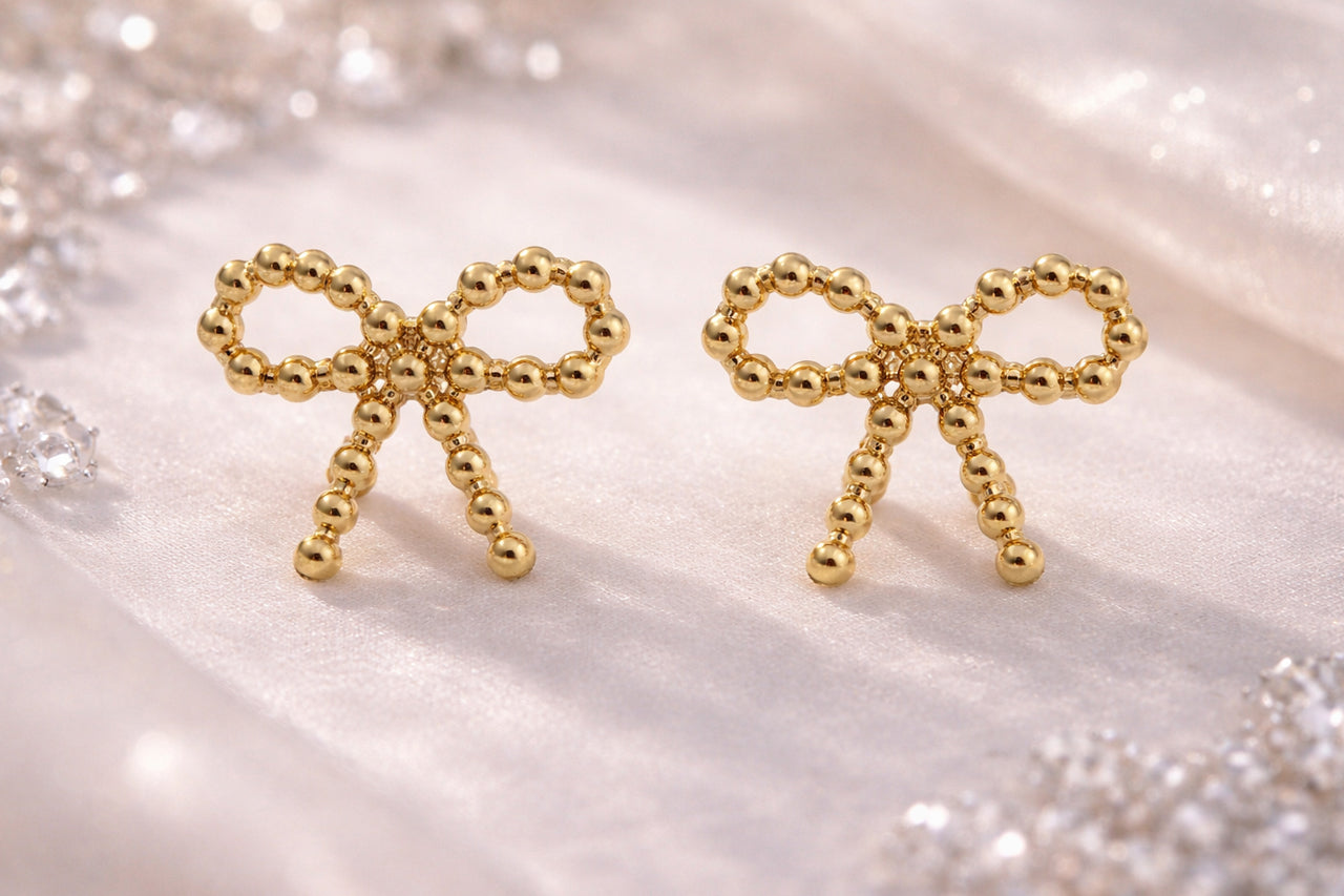 Add a touch of charm to your everyday style with the Golden Bow Beaded Stud Earrings. Designed in a delicate bow silhouette, these earrings are formed with polished gold beads that reflect light beautifully, creating a soft yet luxurious sparkle.