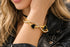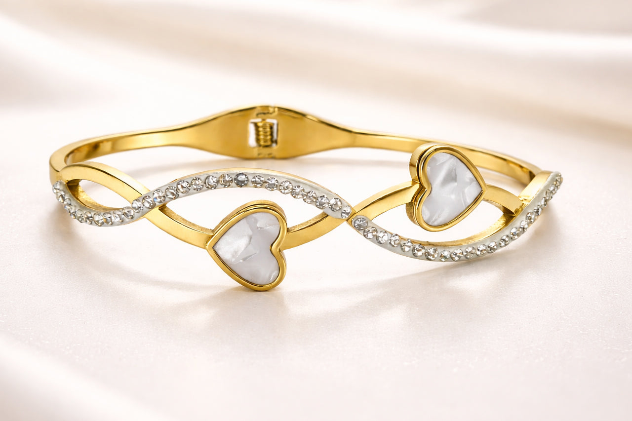 Enamel heart motifs add a bold yet romantic contrast, creating a striking balance between softness and strength. Designed for comfort and everyday wear, this bracelet effortlessly elevates both casual and dressy looks.