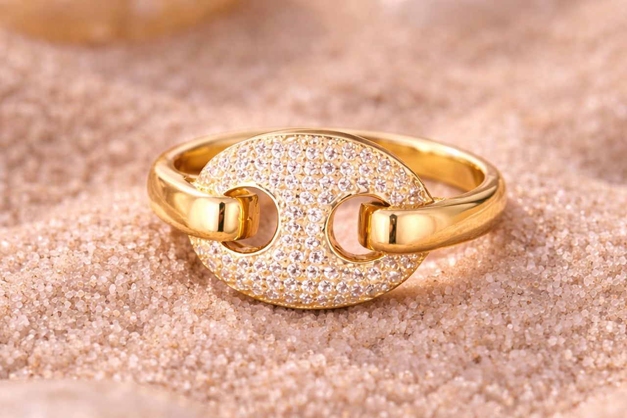The polished gold band adds structure and elegance, while the crystal-studded centre brings luminous brilliance. Perfectly balanced between modern design and timeless luxury, this ring is ideal for statement styling—day or night.