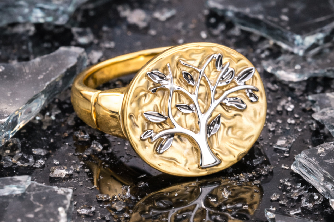 Inspired by the timeless symbolism of nature, the Tree of Life Statement Ring represents strength, balance, and renewal. Crafted with 18K gold plating (3 micron), this elegant ring features a finely detailed tree motif highlighted in a contrasting silver-tone finish, set against a softly textured gold background.