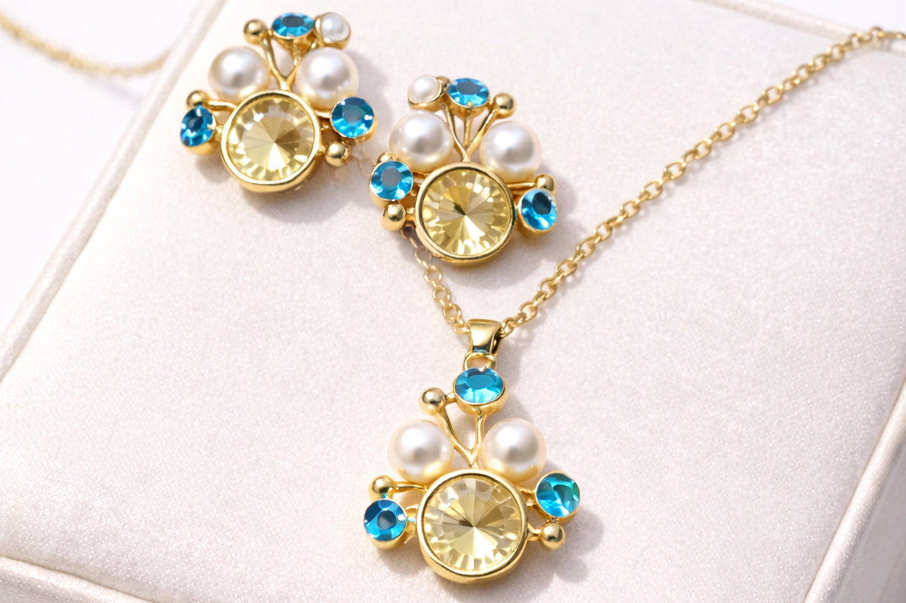 The design features a radiant gold-toned centre stone, surrounded by soft pearls and sparkling blue crystals, giving the set a balanced blend of classic charm and modern elegance. Finished with 18K gold plating, the jewellery offers a refined shine that enhances any outfit—from casual day looks to festive evenings.
